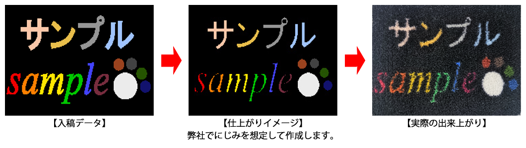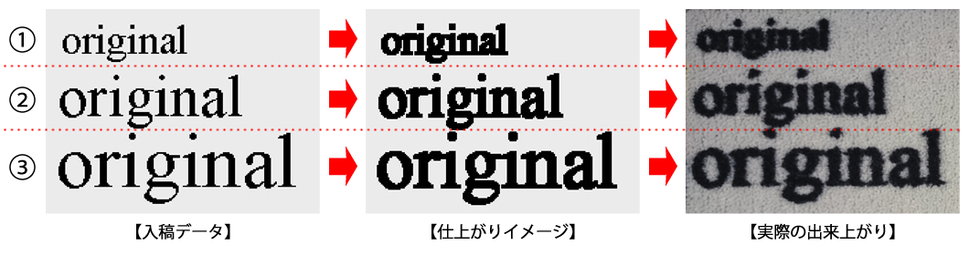 パイル生地に印刷する際には、紙媒体への印刷とは違い必ず塗料のにじみが生じます。特に16番の黒はどの色に対しても約+1~2mmほどの色の侵食がありますので、ご入稿の際は文字のサイズ、太さ等を上記『文字入れについて』の推奨サイズになるよう調整してご入稿いただくことをお勧めいたします。画数の多い漢字をデザインに入れる際は線と線の間隔が狭いため特に推奨サイズに近づけるようにしてご入稿下さい。