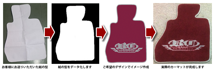 まずは、お客さまのカーマットの形を新聞紙などで、型をとって弊社のさいたま営業所宛に郵送していただきます。※さいたま営業所の詳しい住所はお電話またはお問い合わせフォームにて直接ご確認ください。