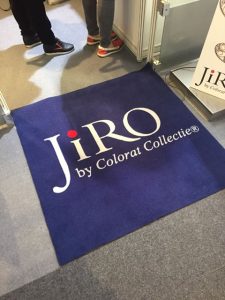 「本日から海外の展示会が始まりまして、早速製作して頂いたマットを使用しておりますのでお写真をお送りします。