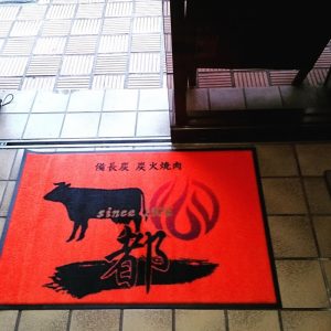 炭火焼肉都様は名刺にも使用されているロゴマークで玄関マットを作られました。お店のエントランスはやはり無地のマットより店名やロゴマークなどが入ったデザインが素敵です。