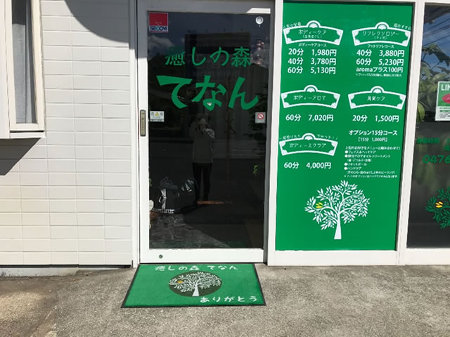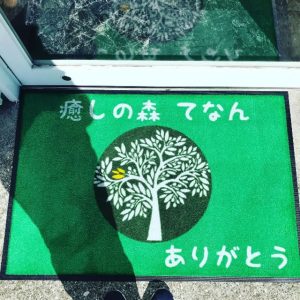 リラクゼーションサロン 癒しの森 てなん 様はお店のイメージカラーを背景色にして店舗入り口のマットを作られました。