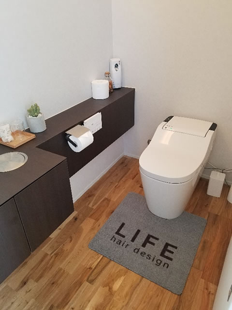 オリジナルトイレマットを作成して、トイレが華やかな空間になりました。オーダーメイドのトイレマットにお店のロゴマークなどを入れることも可能です。LIFE hair design様は、以前に同じデザインの玄関マットを作られていましたが、お揃いのトイレマットをご注文いただきました。