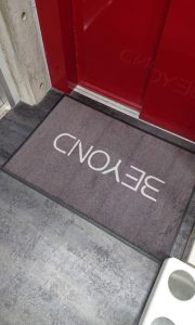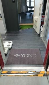 エレベーターが開くとジムのフロアに到着。エレベーター前の玄関マットは看板代わりにもなり、何よりもカッコイイですね。濃いグレーに明るいグレーの文字がとても素敵です。