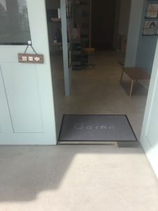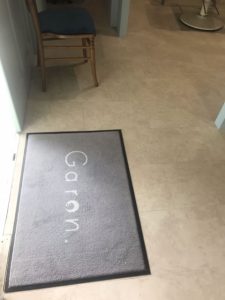 ライトグレーにオフホワイトのロゴを入れた優しい印象の玄関マットができました。市販の商品では、このような色合いの商品はなかなか探せません。ロゴもとても素敵です。
