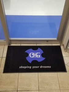 ロゴ入り玄関マットを2枚ご注文いただきました。デザインのうち、黒い部分は基本色16番、青い部分は10、グレーの文字を4、そして白い部分はオプション色の30番というご指定をいただきました。