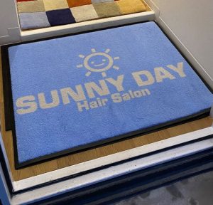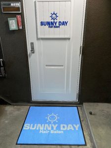 ヘアサロンのドアにあるロゴマークとお揃いの玄関マットがとてもキュートに仕上がりました。ヘアサロン様の場合、掃除機がかけやすいゴムの縁があるタイプがおススメです。
