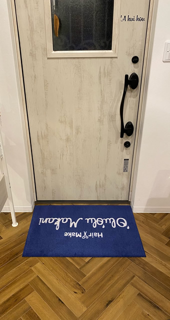 サロンのカラーのネイビーとホワイトに合わせて配色した、縁なし玄関マットをお作りしました。入り口のサイズにピッタリですね!