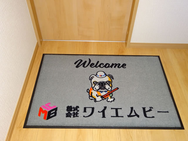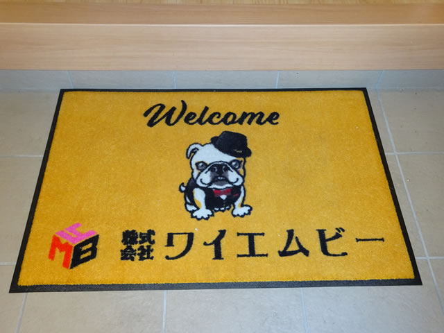 ロゴとマスコットキャラクターをいれた玄関マットをオーダーいただきました。マスコットキャラクターのワンちゃんがとても可愛いですね。