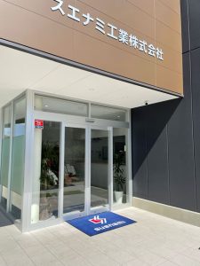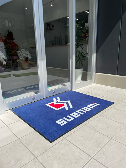 スエナミ工業株式会社様よりいただいたオリジナルマットの設置事例をご紹介します。1200×900㎜サイズのマットに大きく企業ロゴを入れた存在感のある玄関マットに仕上がりました。