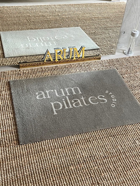 大阪府のピラティススタジオさまよりオリジナルマットの設置写真をお送りいただきました。縁なしのスタイリッシュなデザインが店内の雰囲気と合っていて、とてもおしゃれなスタジオというのが伝わる1枚に仕上がりました。通常マットの周囲には黒いゴム縁が付きますが、重い印象を与えてしまうため、室内でご利用いただく場合にはスタイリッシュで高級感を演出できる縁なしの仕様をお勧めしています。