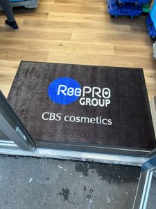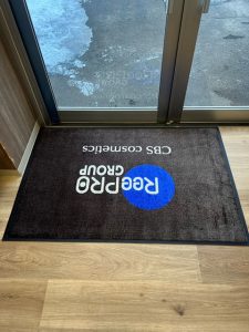 北海道の企業様より社名入りのオリジナル玄関マットをご依頼いただきました。青色のロゴマークが見映えする素敵な仕上がりです。