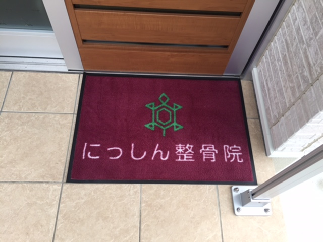「私たちの接骨院の入口は横にスライドする片開きのドアなんですが初めていらした患者さんはどちらから入ればイイのか迷われる方がいます。今まで入口には市販の3千円ほどの安いビニール製品のマットで色はグレー使っていました。でも、今週からは新しいネーム入りのマットのおかげで迷われる方は今のところいません!お値段も安く仕上がりもよく満足しています。ベースのカラーが赤紫な感じで、こげ茶をイメージしていたので想像と違っていましたが今度注文する時はケチらずオプションで好みのカラーを注文したいと思います。雰囲気もグッとよくなりマットひとつでこんなに変わるんですね。長文失礼いたしました。またよろしくお願いします。ありがとうございました。」